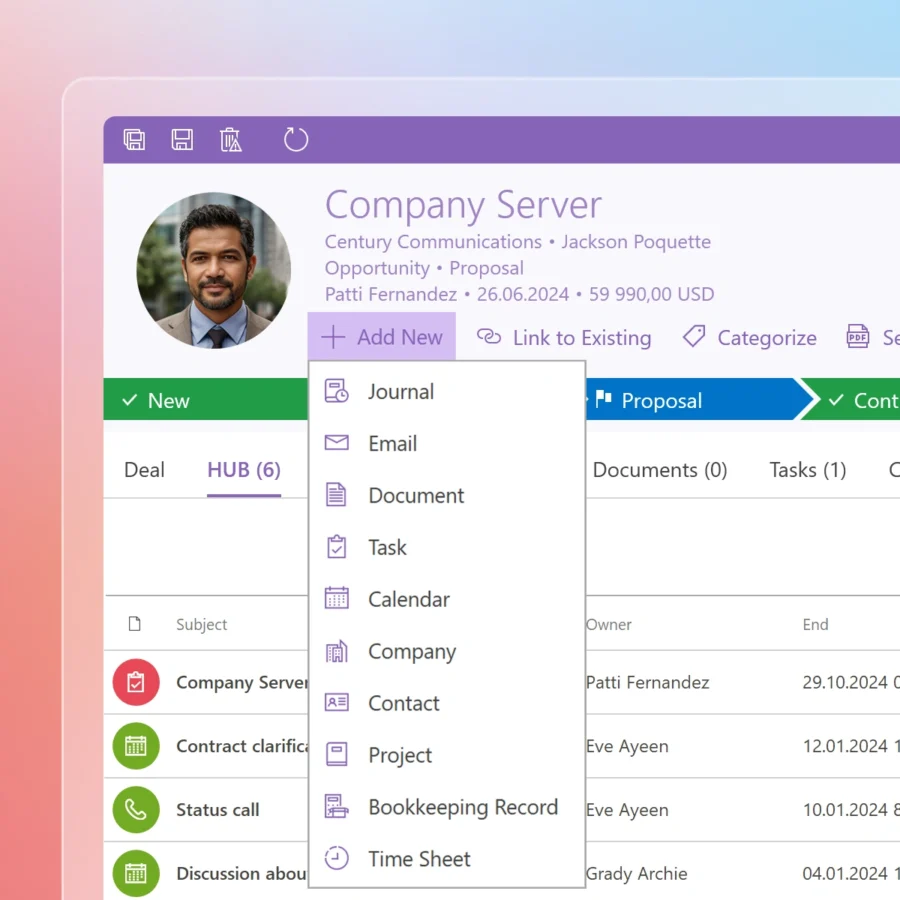eWay-CRM kann Ihre Besprechungen mit einem Kontakt, einem Unternehmen, einem Geschäft oder einem Projekt verknüpfen. So bleibt alles organisiert und miteinander verbunden.